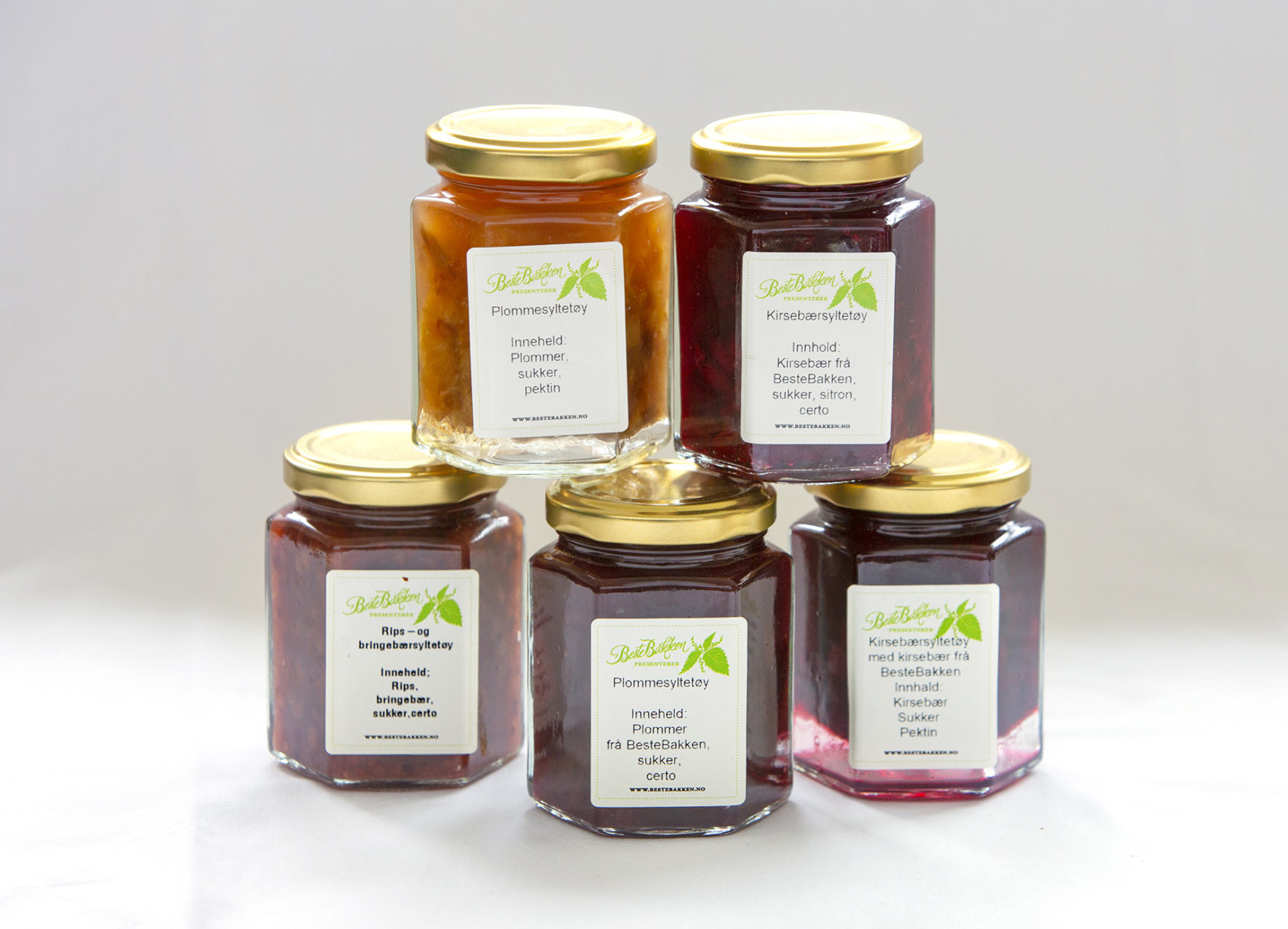 F.eks. syltetøy laga av kirsebær, ripsbær, bringebær og ulike sortar plommer.